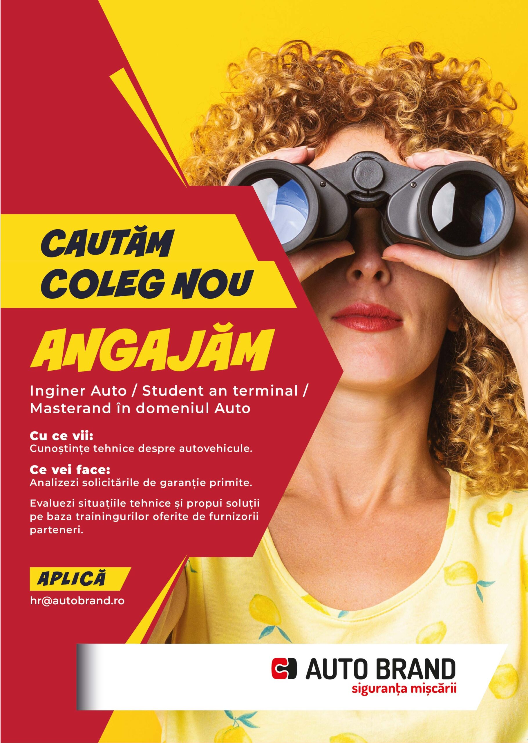 – Formatiune tehnica, sa aiba cunostinte auto despre franare, suspensie, pneumatica pentru a putea evalua cazurile de garantii si solutii tehnice
